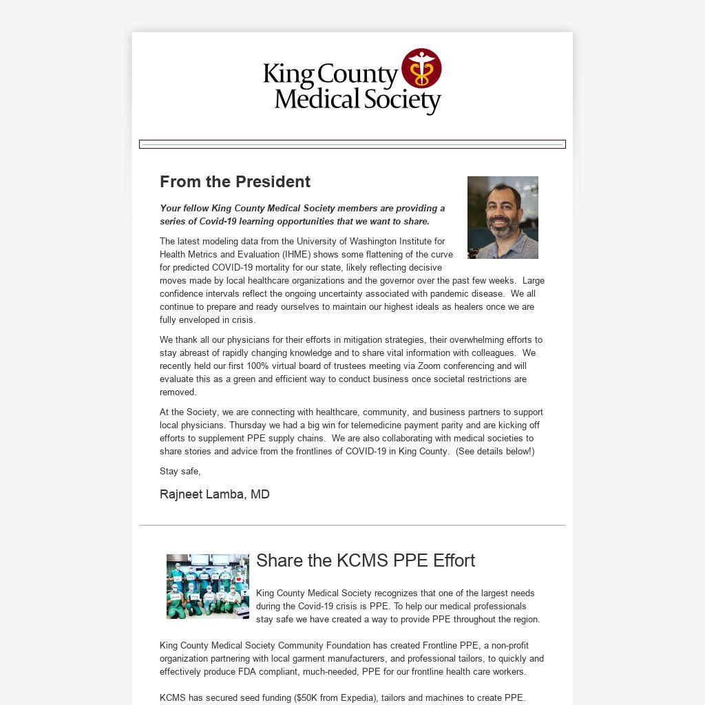 King County Medical Society recognizes that one of the largest needs during the Covid-19 crisis is PPE. To help our medical professionals stay safe we have created a way to provide PPE throughout the region.