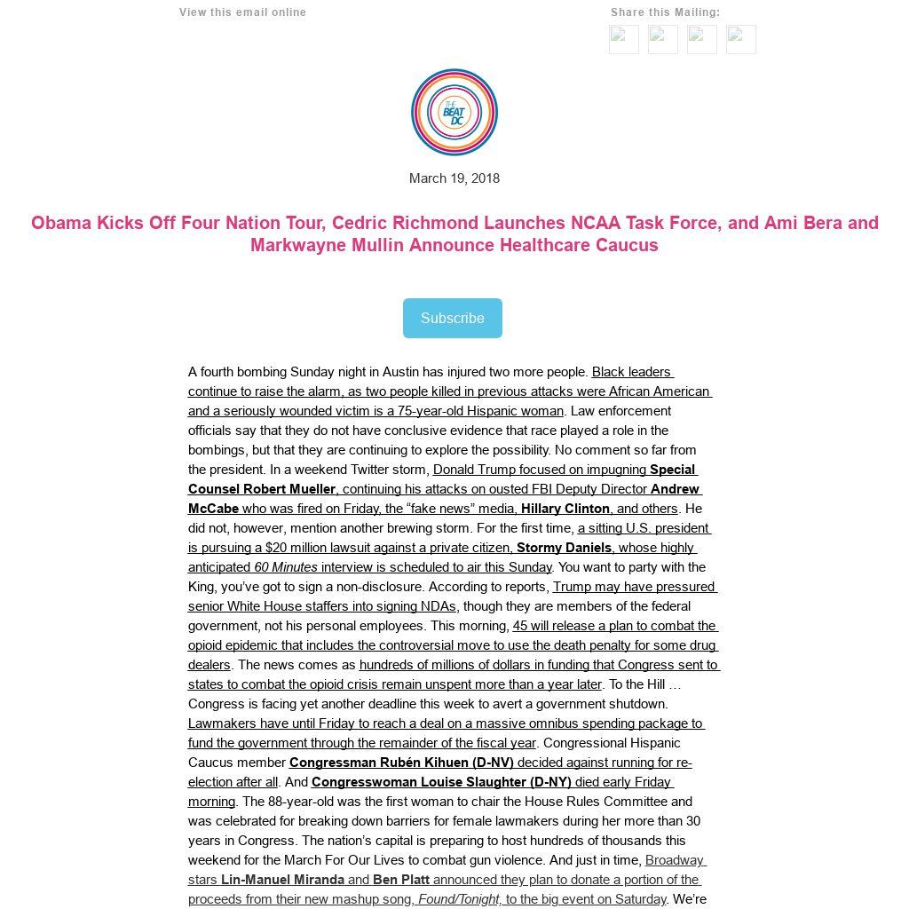 A fourth bombing Sunday night in Austin has injured two more people. Black leaders continue to raise the alarm, as two people killed in previous attacks were African American and a seriously wounded victim is a 75-year-old Hispanic woman. Law enforcement officials say that they do not have conclusive evidence that race played a role in the bombings, but that they are continuing to explore the possibility. No comment so far from the president. In a weekend Twitter storm, Donald Trump focused on impugning Special Counsel Robert Mueller, continuing his attacks on ousted FBI Deputy Director Andrew McCabe who was fired on Friday, the “fake news” media, Hillary Clinton, and others. He did not, however, mention another brewing storm. For the first time, a sitting U.S. president is pursuing a $20 million lawsuit against a private citizen, Stormy Daniels, whose highly anticipated 60 Minutes interview is scheduled to air this Sunday. You want to party with the King, you’ve got to sign a non-disclosure. According to reports, Trump may have pressured senior White House staffers into signing NDAs, though they are members of the federal government, not his personal employees. This morning, 45 will release a plan to combat the opioid epidemic that includes the controversial move to use the death penalty for some drug dealers. The news comes as hundreds of millions of dollars in funding that Congress sent to states to combat the opioid crisis remain unspent more than a year later. To the Hill … Congress is facing yet another deadline this week to avert a government shutdown. Lawmakers have until Friday to reach a deal on a massive omnibus spending package to fund the government through the remainder of the fiscal year. Congressional Hispanic Caucus member Congressman Rubén Kihuen (D-NV) decided against running for re-election after all. And Congresswoman Louise Slaughter (D-NY) died early Friday morning. The 88-year-old was the first woman to chair the House Rules Committee and was celebrated for breaking down barriers for female lawmakers during her more than 30 years in Congress. The nation’s capital is preparing to host hundreds of thousands this weekend for the March For Our Lives to combat gun violence. And just in time, Broadway stars Lin-Manuel Miranda and Ben Platt announced they plan to donate a portion of the proceeds from their new mashup song, Found/Tonight, to the big event on Saturday. We’re kicking off the week with this...