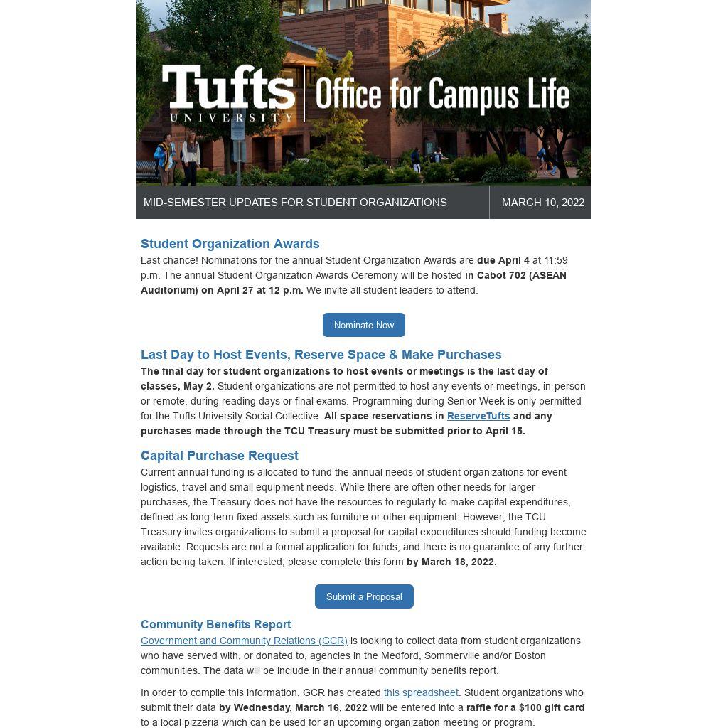 The final day for student organizations to host events or meetings is the last day of classes, May 2. Student organizations are not permitted to host any events or meetings, in-person or remote, during reading days or final exams. Programming during Senior Week is only permitted for the Tufts University Social Collective. All space reservations in ReserveTufts and any purchases made through the TCU Treasury must be submitted prior to April 15.