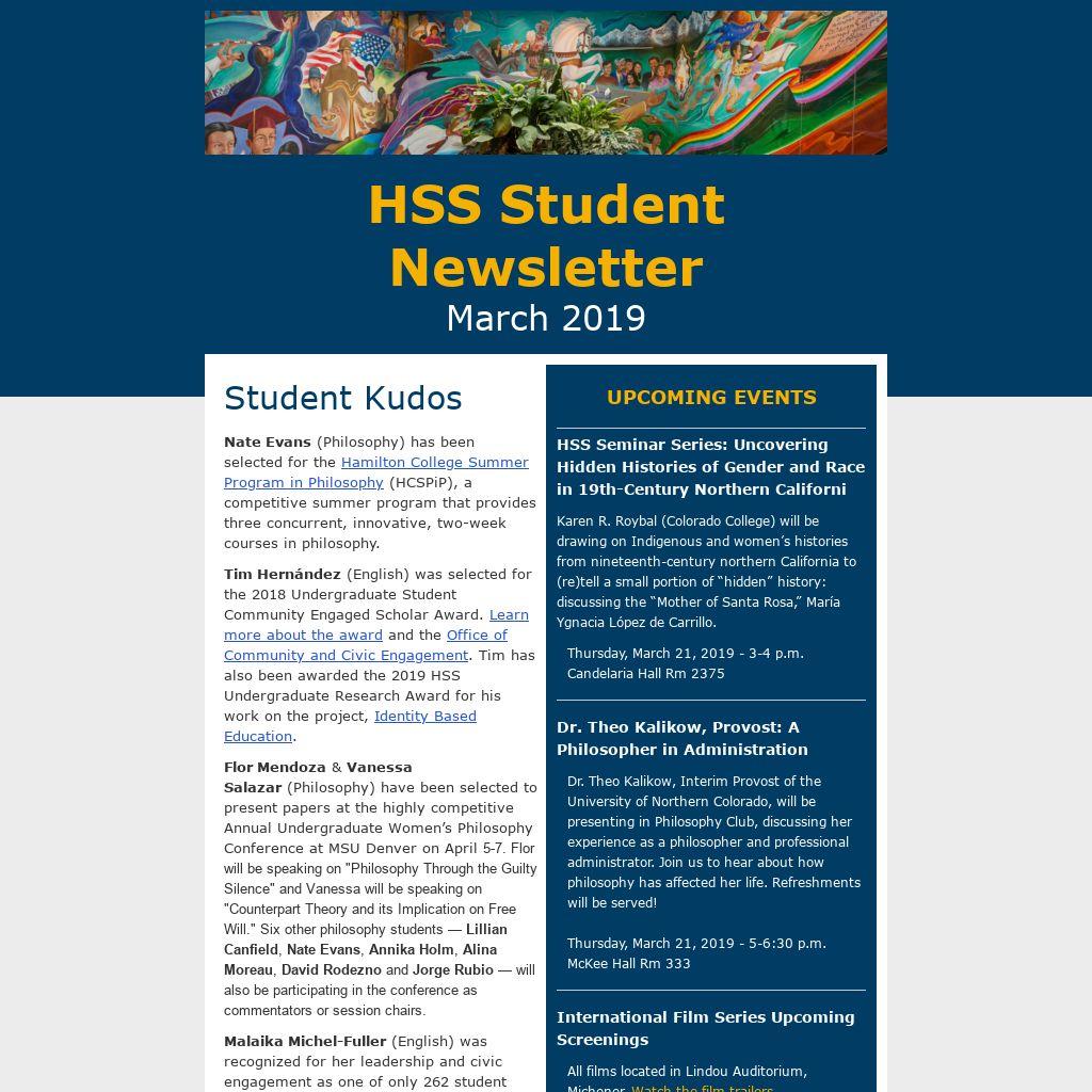 Student Kudos Flor Mendoza & Vanessa Salazar (Philosophy) have been selected to present papers at the highly competitive Annual Undergraduate Women’s Philosophy Conference at MSU Denver on April 5-7. Flor will be speaking on "Philosophy Through the Guilty Silence" and Vanessa will be speaking on "Counterpart Theory and its Implication on Free Will." Six other philosophy students — Lillian Canfield, Nate Evans, Annika Holm, Alina Moreau, David Rodezno and Jorge Rubio — will also be participating in the conference as commentators or session chairs.