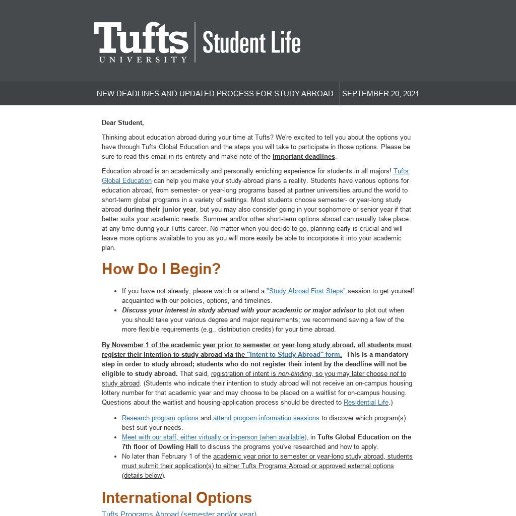 Thinking about education abroad during your time at Tufts? We're excited to tell you about the options you have through Tufts Global Education and the steps you will take to participate in those options. Please be sure to read this email in its entirety and make note of the important deadlines.