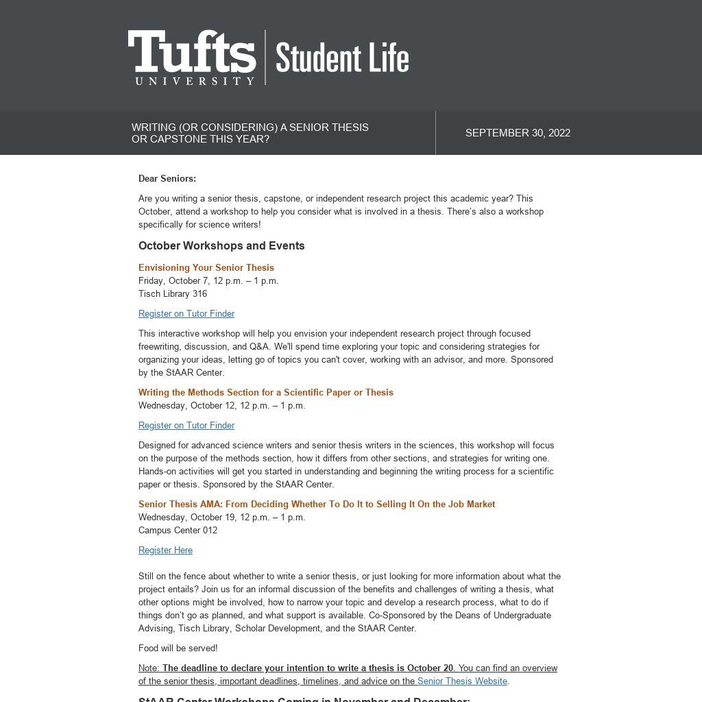 Still on the fence about whether to write a senior thesis, or just looking for more information about what the project entails? Join us for an informal discussion of the benefits and challenges of writing a thesis, what other options might be involved, how to narrow your topic and develop a research process, what to do if things don’t go as planned, and what support is available. Co-Sponsored by the Deans of Undergraduate Advising, Tisch Library, Scholar Development, and the StAAR Center.