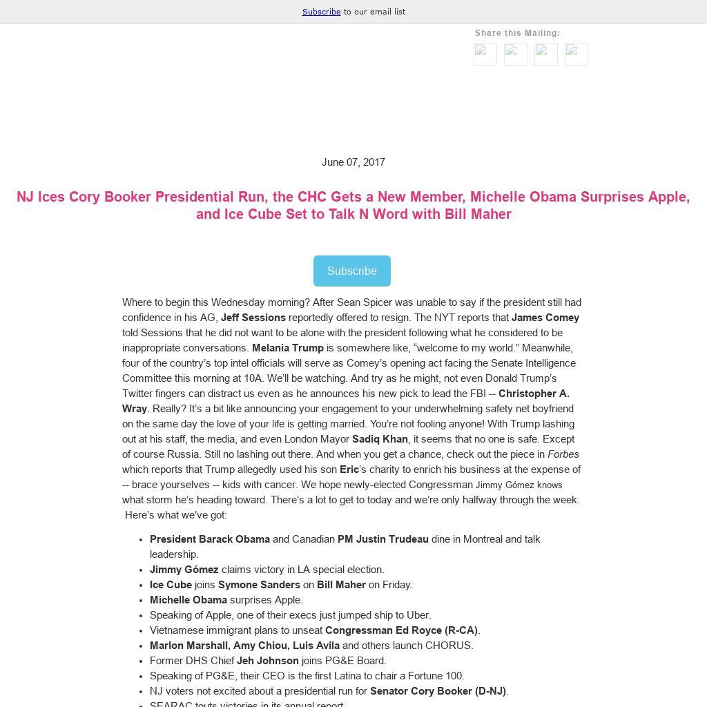 | Where to begin this Wednesday morning? After Sean Spicer was unable to say if the president still had confidence in his AG, Jeff Sessions reportedly offered to resign. The NYT reports that James Comey told Sessions that he did not want to be alone with the president following what he considered to be inappropriate conversations. Melania Trump is somewhere like, “welcome to my world.” Meanwhile, four of the country’s top intel officials will serve as Comey’s opening act facing the Senate Intelligence Committee this morning at 10A. We’ll be watching. And try as he might, not even Donald Trump’s Twitter fingers can distract us even as he announces his new pick to lead the FBI -- Christopher A. Wray. Really? It’s a bit like announcing your engagement to your underwhelming safety net boyfriend on the same day the love of your life is getting married. You’re not fooling anyone! With Trump lashing out at his staff, the media, and even London Mayor Sadiq Khan, it seems that no one is safe. Except of course Russia. Still no lashing out there. And when you get a chance, check out the piece in Forbes which reports that Trump allegedly used his son Eric’s charity to enrich his business at the expense of -- brace yourselves -- kids with cancer. We hope newly-elected Congressman Jimmy Gómez knows what storm he’s heading toward. There’s a lot to get to today and we’re only halfway through the week. Here’s what we’ve got: