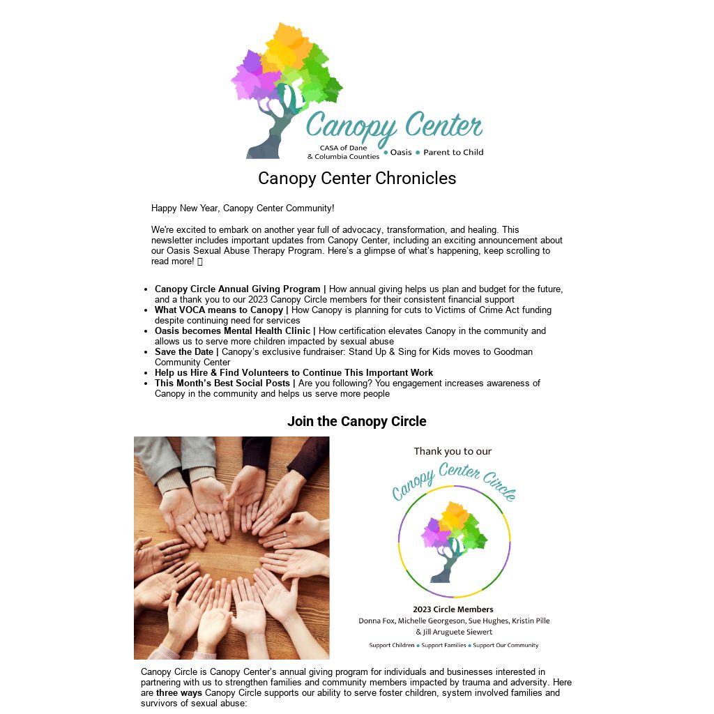 We're excited to embark on another year full of advocacy, transformation, and healing. This newsletter includes important updates from Canopy Center, including an exciting announcement about our Oasis Sexual Abuse Therapy Program. Here’s a glimpse of what’s happening, keep scrolling to read more! 🙂