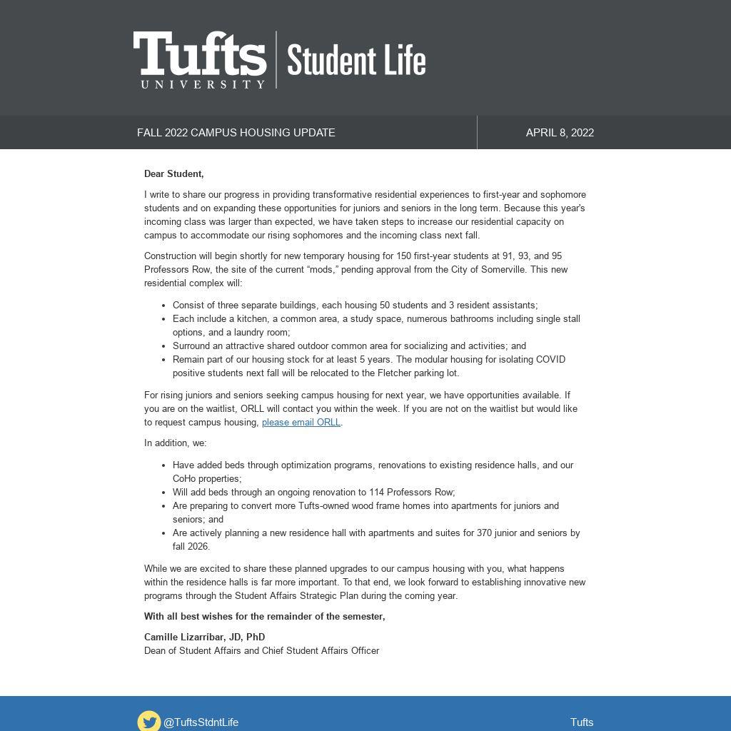 - Are preparing to convert more Tufts-owned wood frame homes into apartments for juniors and seniors; and