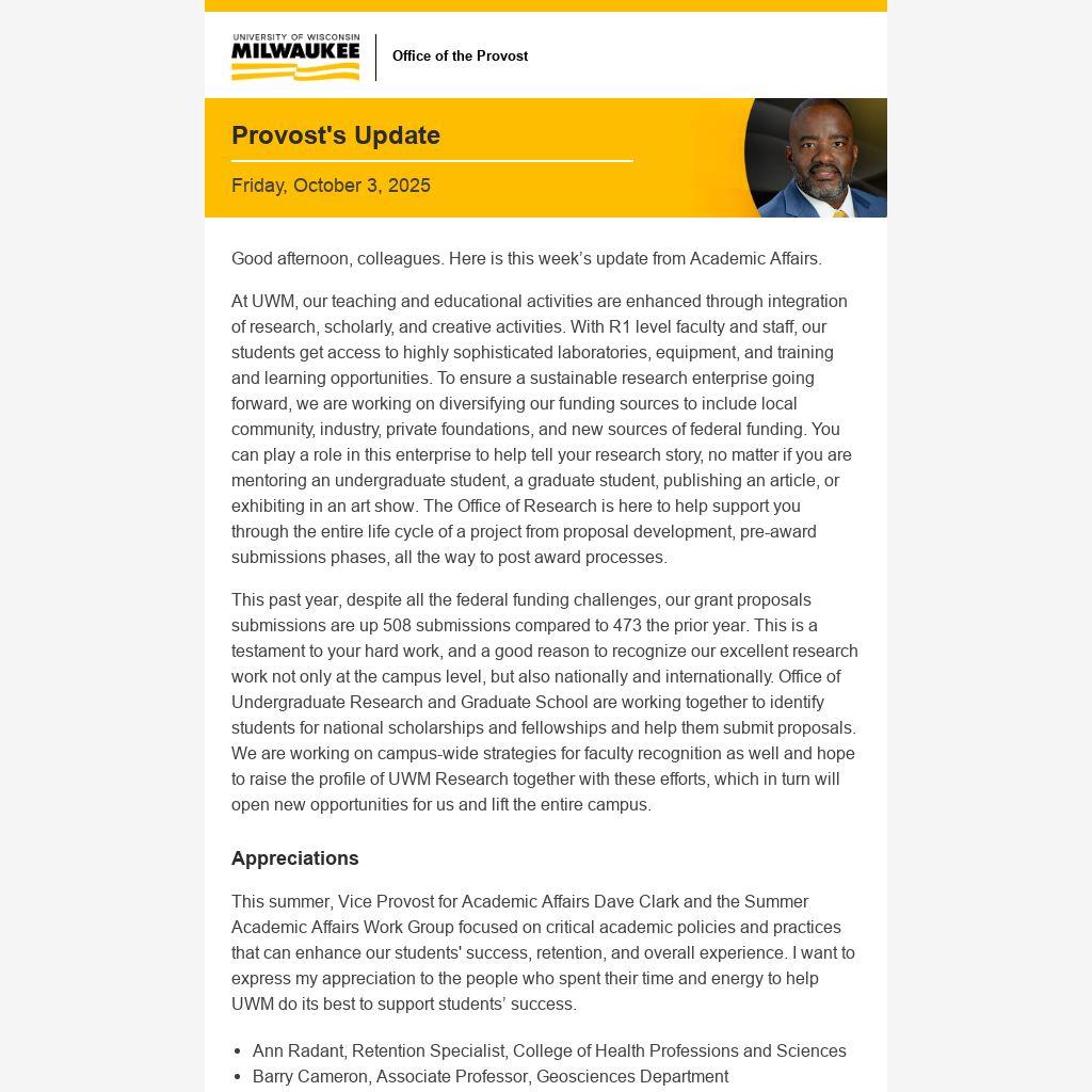 This summer, Vice Provost for Academic Affairs Dave Clark and the Summer Academic Affairs Work Group focused on critical academic policies and practices that can enhance our students' success, retention, and overall experience. I want to express my appreciation to the people who spent their time and energy to help UWM do its best to support students’ success.