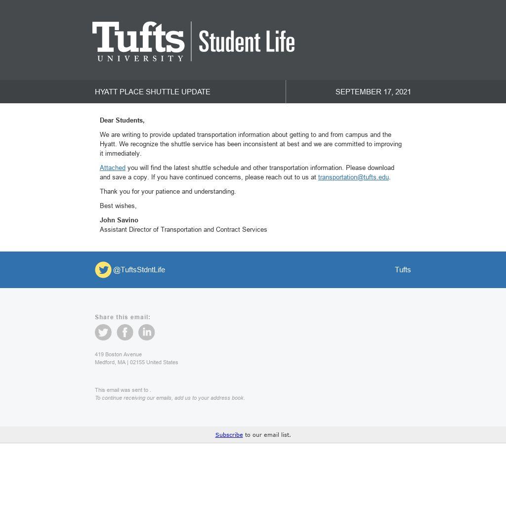 Attached you will find the latest shuttle schedule and other transportation information. Please download and save a copy. If you have continued concerns, please reach out to us at transportation@tufts.edu.