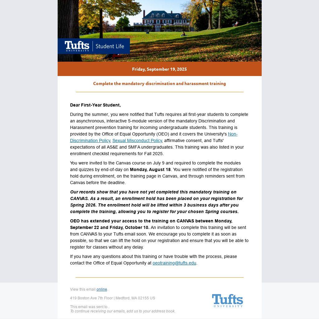 During the summer, you were notified that Tufts requires all first-year students to complete an asynchronous, interactive 5-module version of the mandatory Discrimination and Harassment prevention training for incoming undergraduate students. This training is provided by the Office of Equal Opportunity (OEO) and it covers the University's Non-Discrimination Policy, Sexual Misconduct Policy, affirmative consent, and Tufts' expectations of all AS&E and SMFA undergraduates. This training was also listed in your enrollment checklist requirements for Fall 2025.