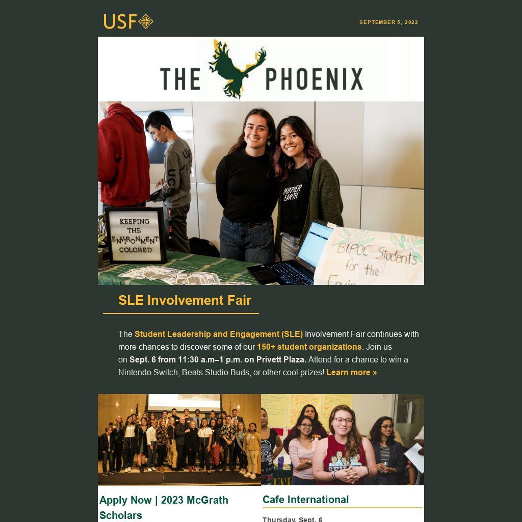 The Phoenix is a weekly e-newsletter sent by Student Leadership and Engagement to help students stay connected and get involved. It features campus events, leadership opportunities, athletic games, workshops, retreats, and more. Why “The Phoenix” title? The Phoenix has long been associated with the history and growth of USF as well as St. Ignatius, who encouraged followers to “go forth and set the world on fire.” Learn more »