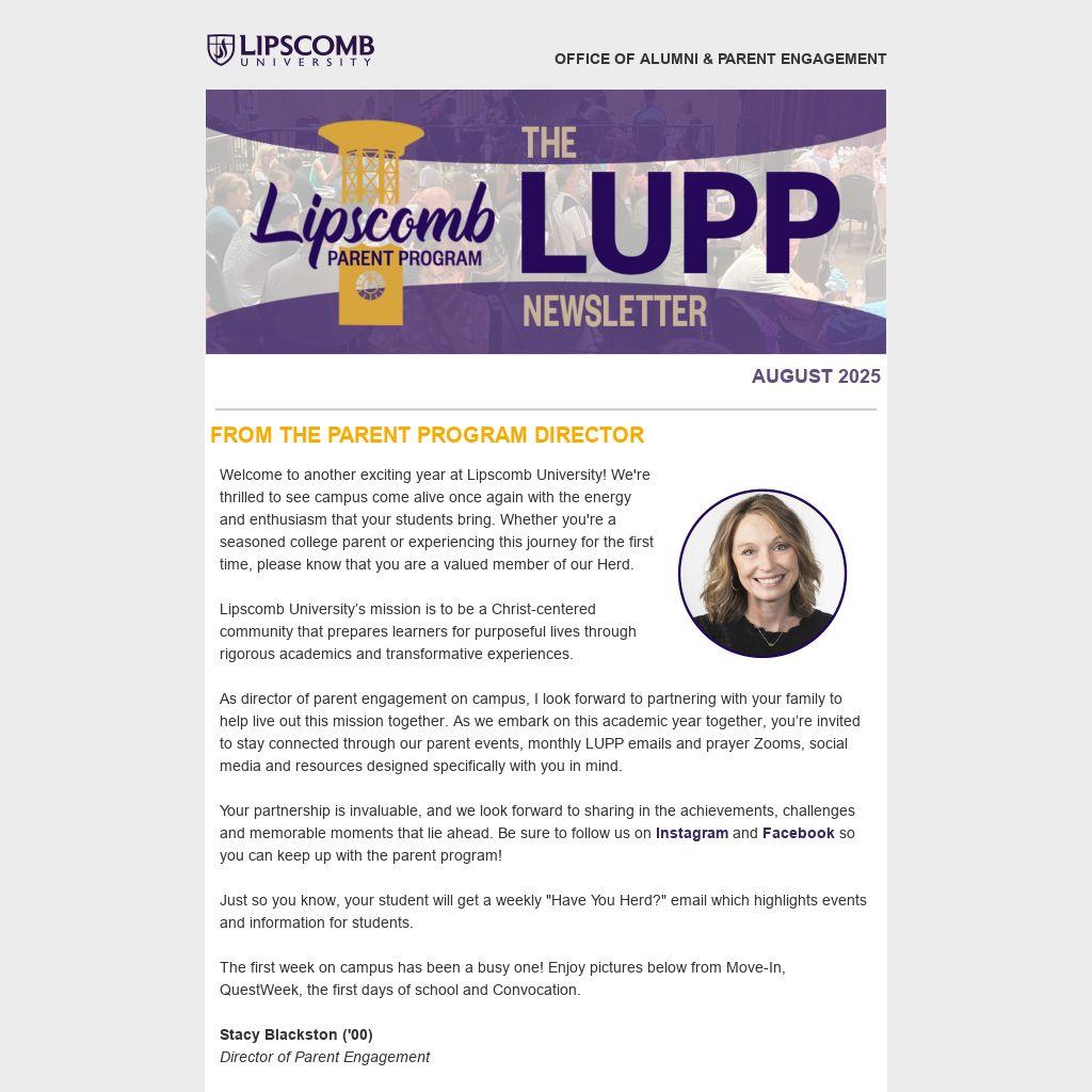 Welcome to another exciting year at Lipscomb University! We're thrilled to see campus come alive once again with the energy and enthusiasm that your students bring. Whether you're a seasoned college parent or experiencing this journey for the first time, please know that you are a valued member of our Herd.