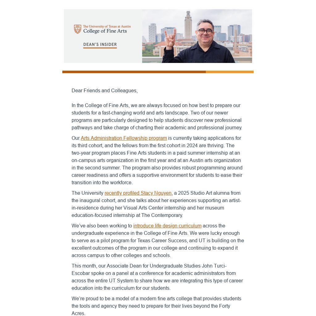We’ve also been working to introduce life design curriculum across the undergraduate experience in the College of Fine Arts. We were lucky enough to serve as a pilot program for Texas Career Success, and UT is building on the excellent outcomes of the program in our college and continuing to expand it across campus to other colleges and schools.