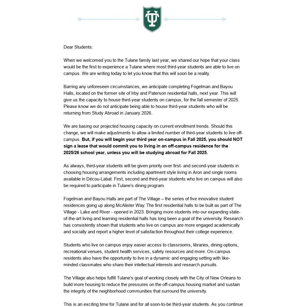 When we welcomed you to the Tulane family last year, we shared our hope that your class would be the first to experience a Tulane where most third-year students are able to live on campus. We are writing today to let you know that this will soon be a reality.