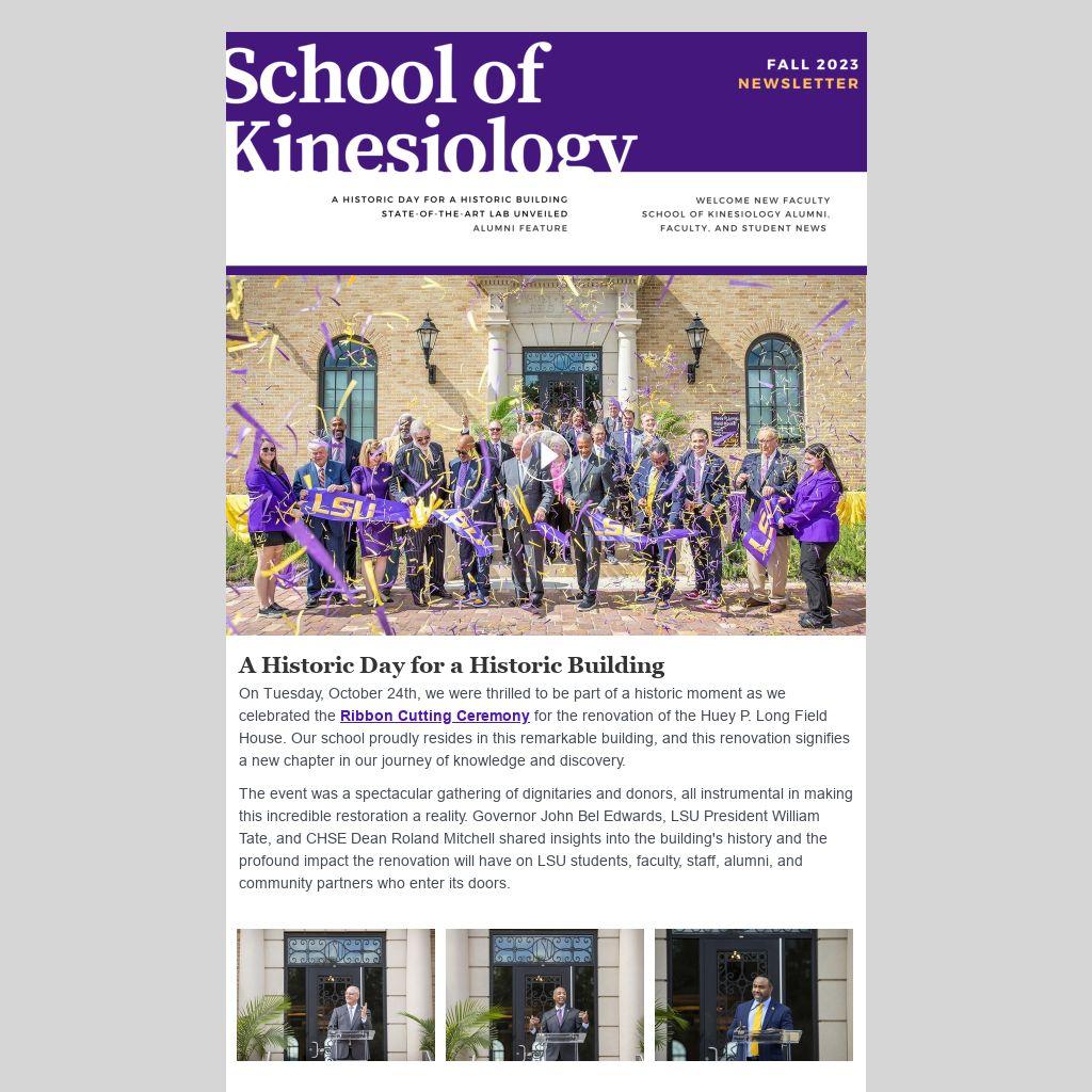 Later in the afternoon, a ribbon-cutting celebration for the Amelia M. Lee School of Kinesiology Director's Admin Suite took place, honoring former LSU Department of Kinesiology Chair, Amelia Lee, for her remarkable contributions to LSU and the field of Kinesiology.