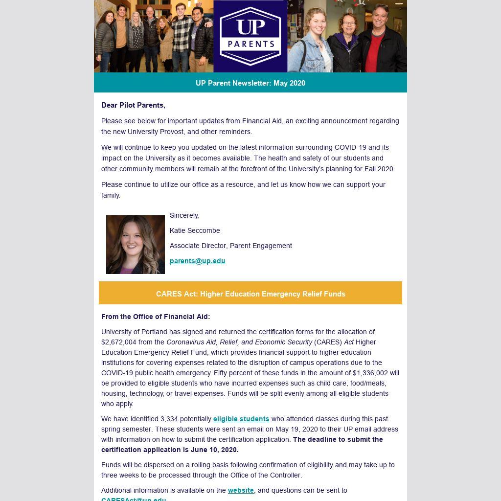 University of Portland has signed and returned the certification forms for the allocation of $2,672,004 from the Coronavirus Aid, Relief, and Economic Security (CARES) Act Higher Education Emergency Relief Fund, which provides financial support to higher education institutions for covering expenses related to the disruption of campus operations due to the COVID-19 public health emergency. Fifty percent of these funds in the amount of $1,336,002 will be provided to eligible students who have incurred expenses such as child care, food/meals, housing, technology, or travel expenses. Funds will be split evenly among all eligible students who apply.