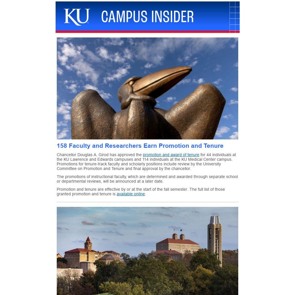 Chancellor Douglas A. Girod has approved the promotion and award of tenure for 44 individuals at the KU Lawrence and Edwards campuses and 114 individuals at the KU Medical Center campus. Promotions for tenure-track faculty and scholarly positions include review by the University Committee on Promotion and Tenure and final approval by the chancellor.