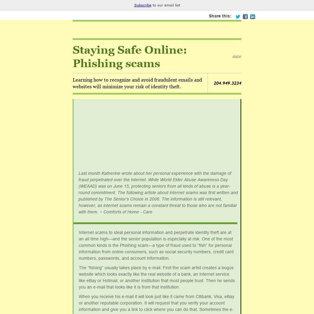 Internet scams to steal personal information and perpetrate identity theft are at an all time high—and the senior population is especially at risk. One of the most common kinds is the Phishing scam—a type of fraud used to “fish” for personal information from online consumers, such as social security numbers, credit card numbers, passwords, and account information.