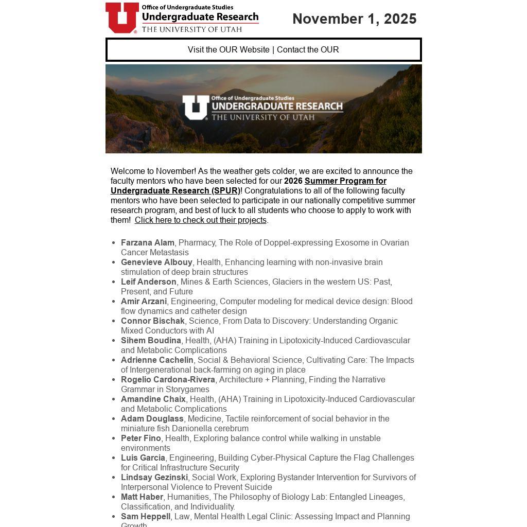 Welcome to November! As the weather gets colder, we are excited to announce the faculty mentors who have been selected for our 2026 Summer Program for Undergraduate Research (SPUR)! Congratulations to all of the following faculty mentors who have been selected to participate in our nationally competitive summer research program, and best of luck to all students who choose to apply to work with them! Click here to check out their projects.