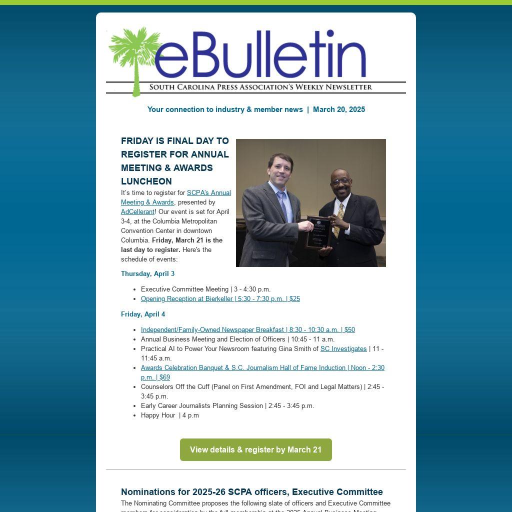 FRIDAY IS FINAL DAY TO REGISTER FOR ANNUAL MEETING & AWARDS LUNCHEONIt’s time to register for SCPA’s Annual Meeting & Awards, presented by AdCellerant! Our event is set for April 3-4, at the Columbia Metropolitan Convention Center in downtown Columbia. Friday, March 21 is the last day to register. Here's the schedule of events: