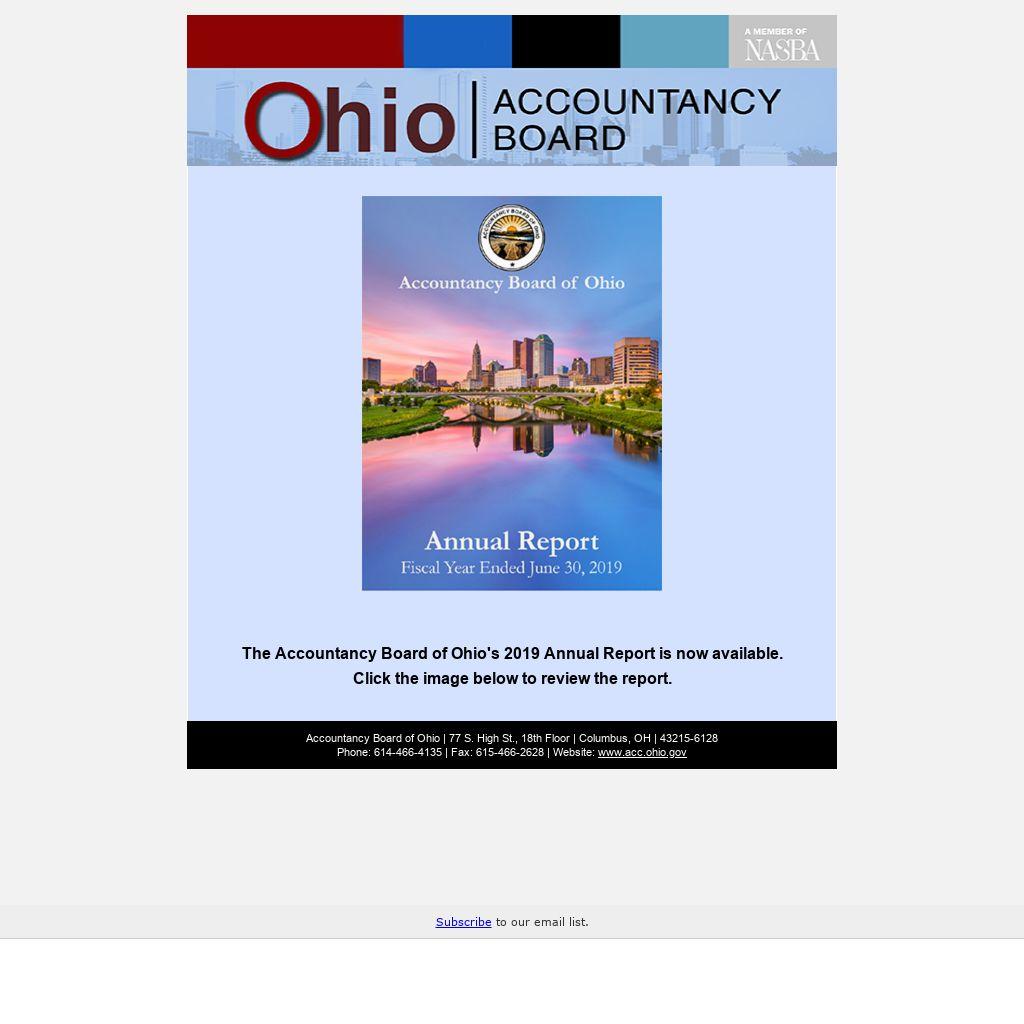 The Accountancy Board of Ohio's 2019 Annual Report is now available. Click the image below to review the report.