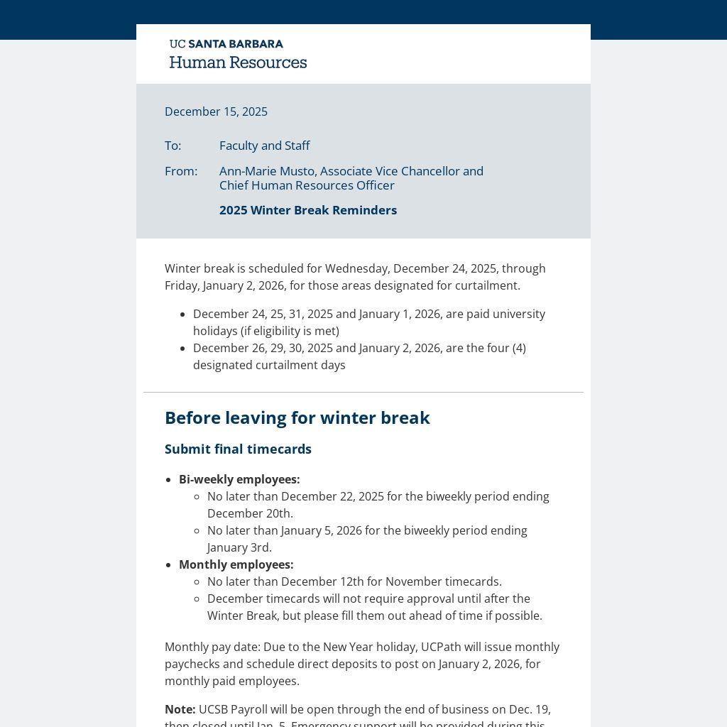 Note: UCSB Payroll will be open through the end of business on Dec. 19, then closed until Jan. 5. Emergency support will be provided during this period and requests should be directed to BFS/Payroll by submitting a BFS/ServiceNow ticket.