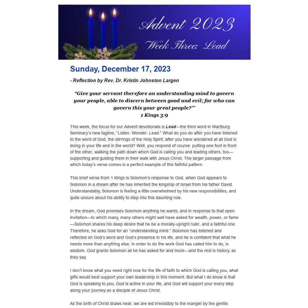 This week, the focus for our Advent devotionals is Lead—the third word in Wartburg Seminary’s new tagline, “Listen. Wonder. Lead.” What do you do after you have listened to the word of God, the stirrings of the Holy Spirit; after you have wondered at all God is doing in your life and in the world? Well, you respond of course: putting one foot in front of the other, walking the path down which God is calling you and leading others, too—supporting and guiding them in their walk with Jesus Christ. The larger passage from which today’s verse comes is a perfect example of this faithful pattern.