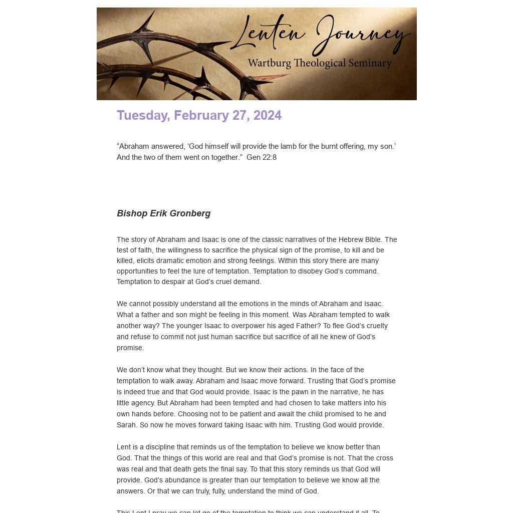 This Lent I pray we can let go of the temptation to think we can understand it all. To wonder at the power and mystery of a story of faith millennia long. To have the perspective that while our days seem long in the vast history of humanity we are but a part. And that God fulfills God’s promises. God provides.