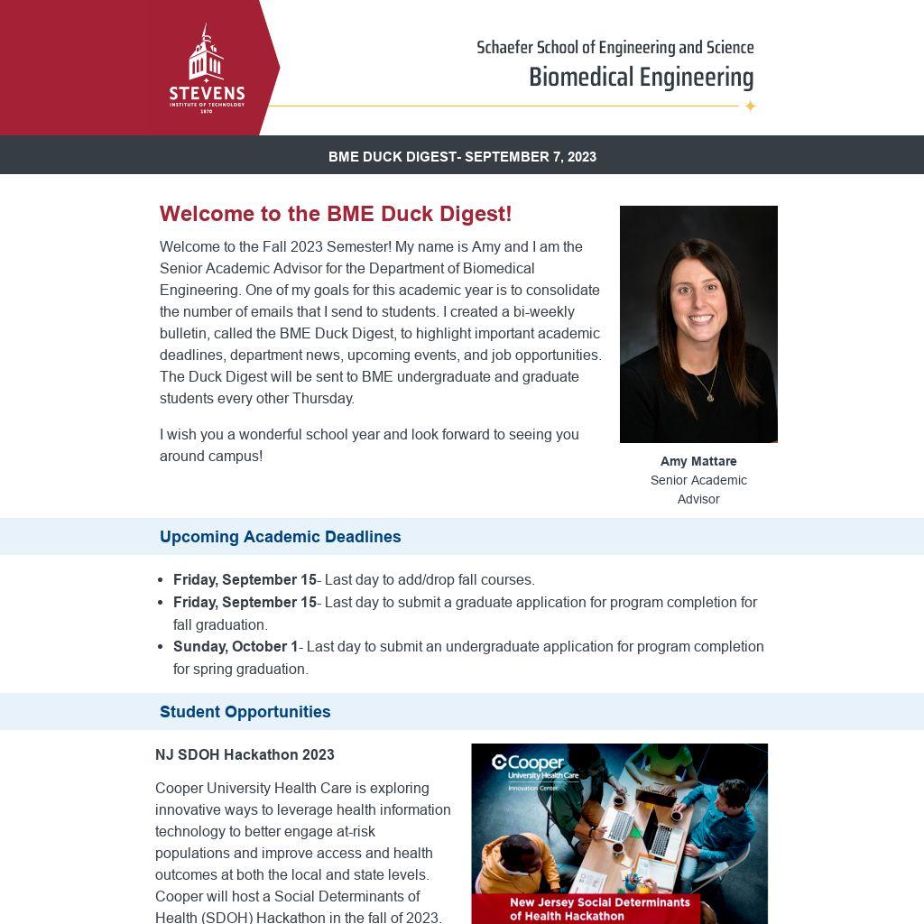 Welcome to the Fall 2023 Semester! My name is Amy and I am the Senior Academic Advisor for the Department of Biomedical Engineering. One of my goals for this academic year is to consolidate the number of emails that I send to students. I created a bi-weekly bulletin, called the BME Duck Digest, to highlight important academic deadlines, department news, upcoming events, and job opportunities. The Duck Digest will be sent to BME undergraduate and graduate students every other Thursday.