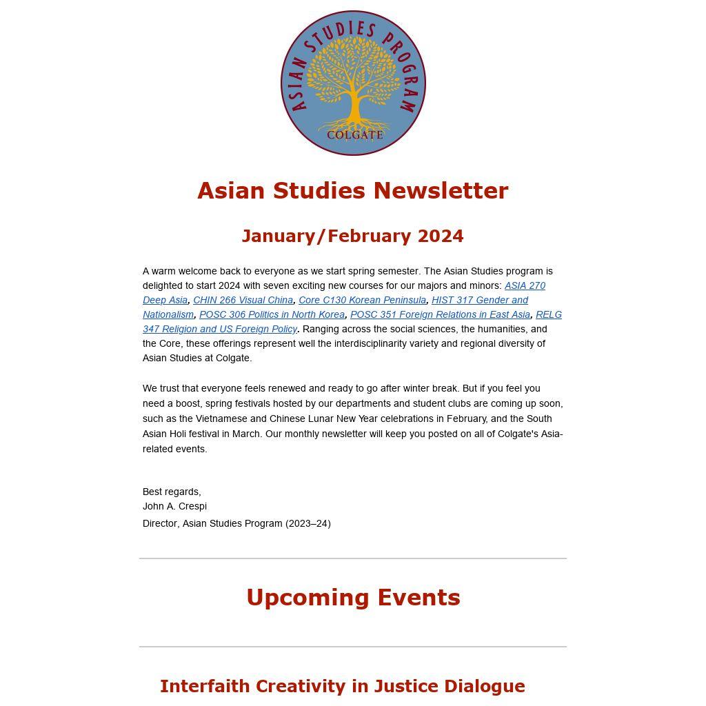 We trust that everyone feels renewed and ready to go after winter break. But if you feel you need a boost, spring festivals hosted by our departments and student clubs are coming up soon, such as the Vietnamese and Chinese Lunar New Year celebrations in February, and the South Asian Holi festival in March. Our monthly newsletter will keep you posted on all of Colgate's Asia-related events.