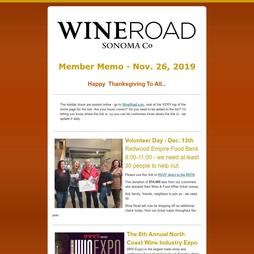 Wine Road will now be dropping off an additional check today, from our ticket sales throughout the year.