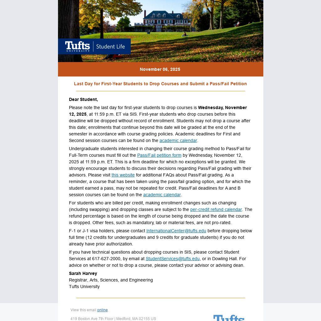 Please note the last day for first-year students to drop courses is Wednesday, November 12, 2025, at 11:59 p.m. ET via SIS. First-year students who drop courses before this deadline will be dropped without record of enrollment. Students may not drop a course after this date; enrollments that continue beyond this date will be graded at the end of the semester in accordance with course grading policies. Academic deadlines for First and Second session courses can be found on the academic calendar.