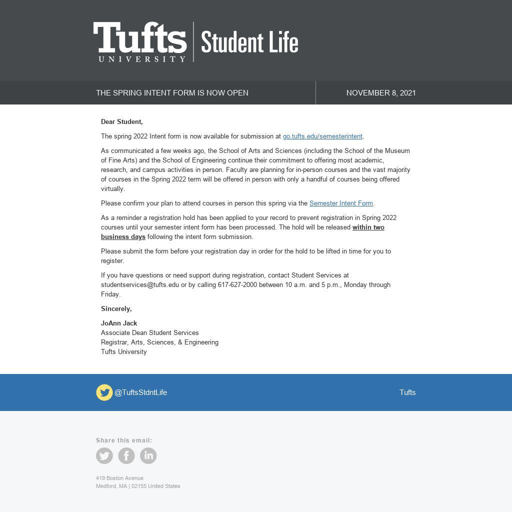 As communicated a few weeks ago, the School of Arts and Sciences (including the School of the Museum of Fine Arts) and the School of Engineering continue their commitment to offering most academic, research, and campus activities in person. Faculty are planning for in-person courses and the vast majority of courses in the Spring 2022 term will be offered in person with only a handful of courses being offered virtually.