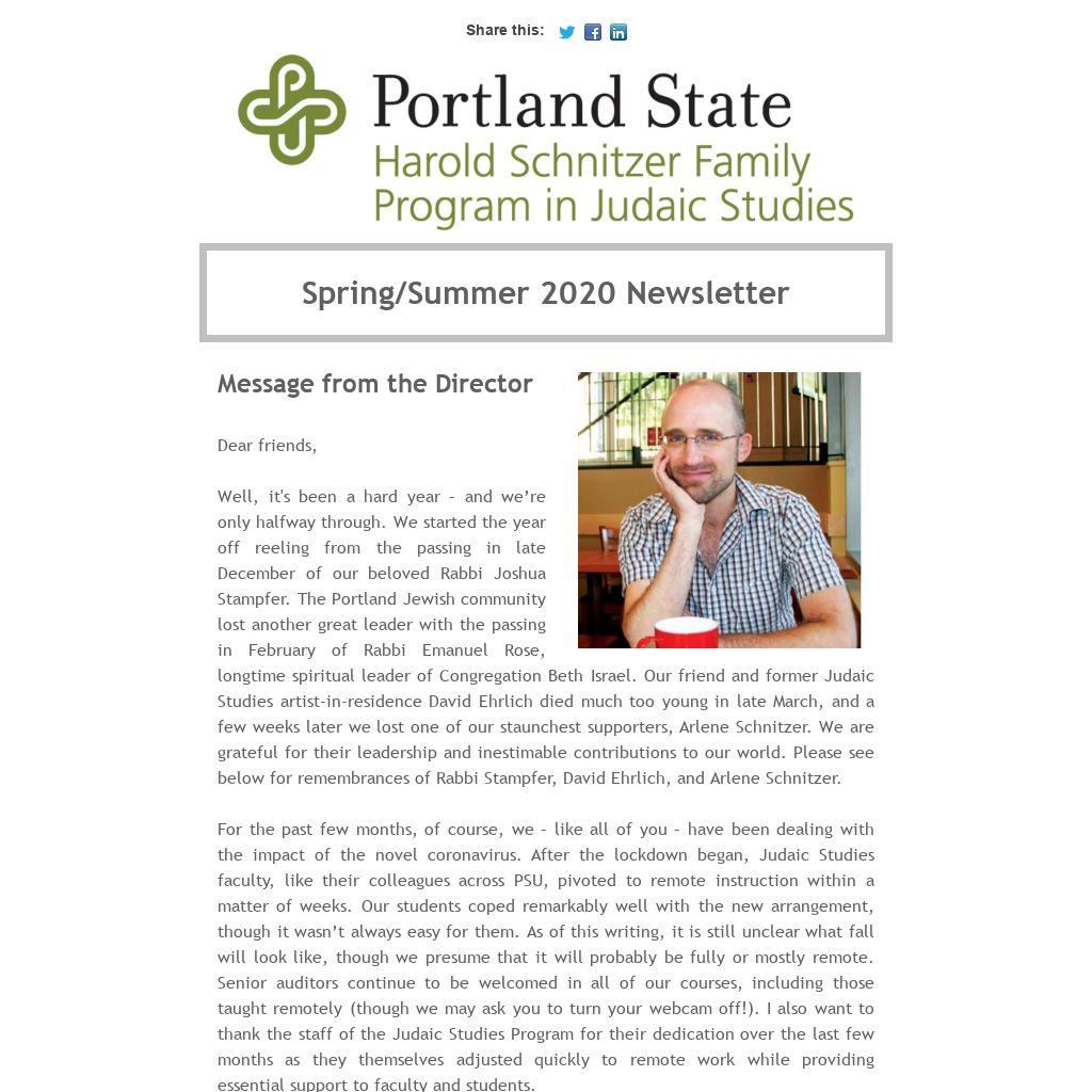 Thankfully, there have been some wonderful bright spots. Our Gus and Libby Solomon Memorial Lecture in January featured Eddy Portnoy of the YIVO Institute with a lively talk on “The Seamy Underbelly of Yiddishland -- Brawlers, Crooks and Charlatans in the Yiddish Press,” and in early June we celebrated the accomplishments of our largest graduating cohort ever: three majors and four minors. The fact that our graduation took place on Zoom made it no less festive. We’re so proud of all of our graduates, and are particularly gratified that Judaic Studies minor Sarah Rohr was chosen to be one of four student speakers at the graduation ceremony of the College of Liberal Arts and Sciences (watch her inspiring speech here). We also want to extend a hearty mazel tov to Jordan Schnitzer, a longtime supporter of our program, on receiving an honorary Doctorate of Humane Letters from PSU’s College of the Arts. (You can watch President Percy’s conferral of the degree, as well as Jordan’s charge to graduates – which includes his rendition of Sonny and Cher’s “I Got You Babe”! – here.