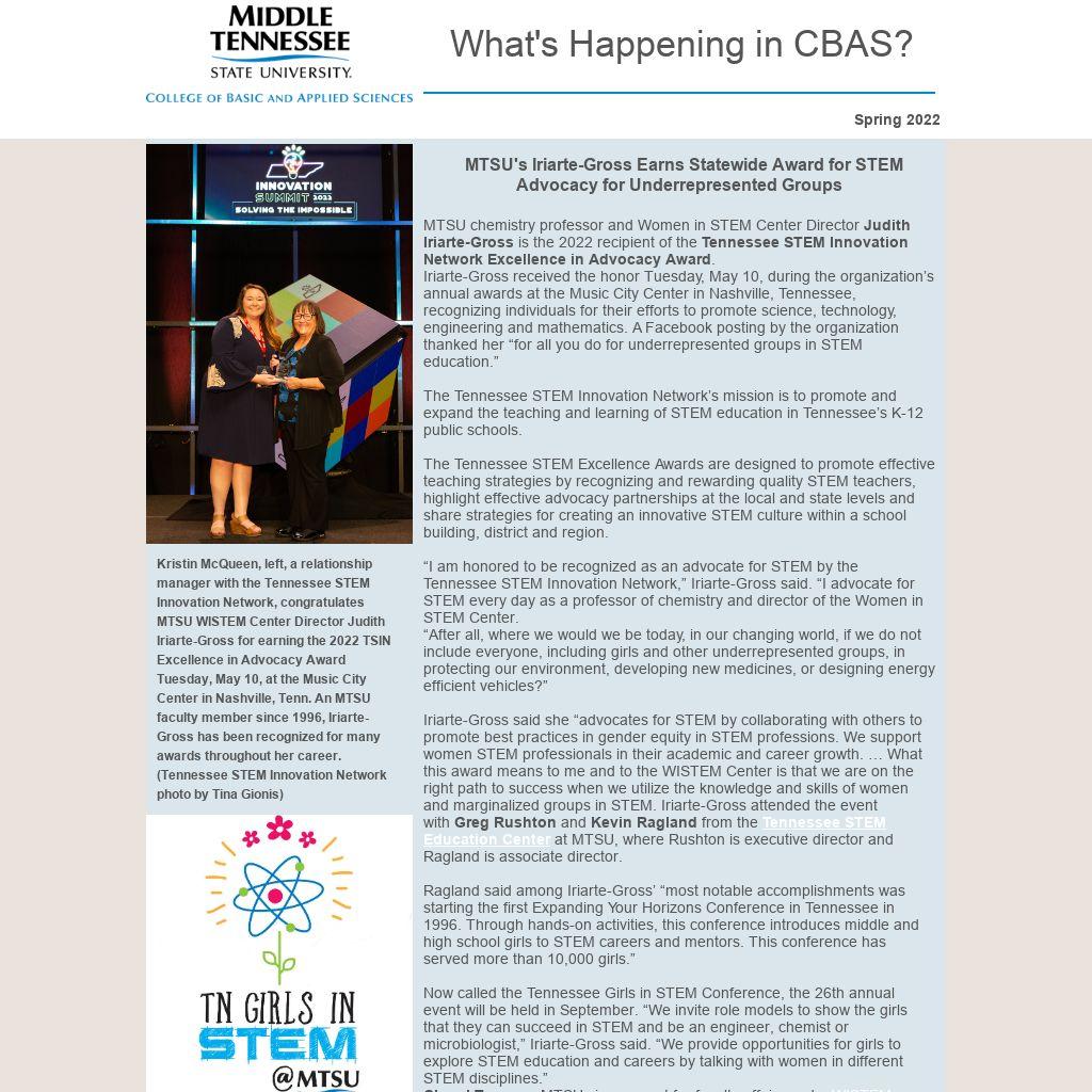 “I am honored to be recognized as an advocate for STEM by the Tennessee STEM Innovation Network,” Iriarte-Gross said. “I advocate for STEM every day as a professor of chemistry and director of the Women in STEM Center.