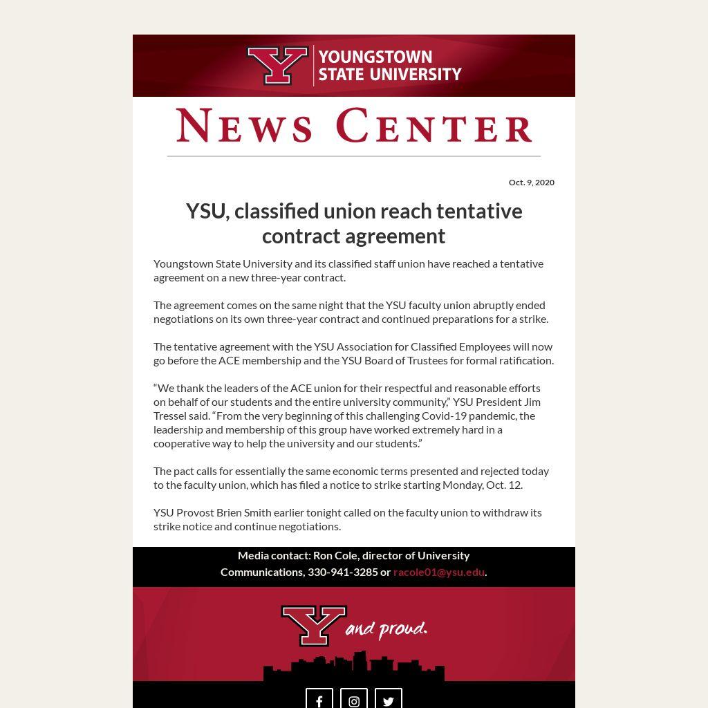 “We thank the leaders of the ACE union for their respectful and reasonable efforts on behalf of our students and the entire university community,” YSU President Jim Tressel said. “From the very beginning of this challenging Covid-19 pandemic, the leadership and membership of this group have worked extremely hard in a cooperative way to help the university and our students.”