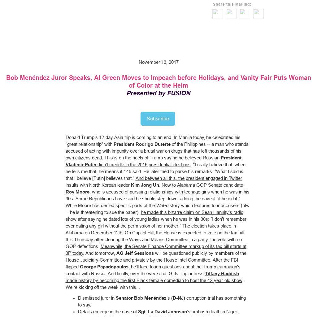Donald Trump’s 12-day Asia trip is coming to an end. In Manila today, he celebrated his “great relationship” with President Rodrigo Duterte of the Philippines -- a man who stands accused of acting with impunity over a brutal war on drugs that has left thousands of his own citizens dead. This is on the heels of Trump saying he believed Russian President Vladimir Putin didn’t meddle in the 2016 presidential elections. “I really believe that, when he tells me that, he means it,” 45 said. He later tried to parse his remarks. “What I said is that I believe [Putin] believes that.” And between all this, the president engaged in Twitter insults with North Korean leader Kim Jong Un. Now to Alabama GOP Senate candidate Roy Moore, who is accused of pursuing relationships with teenage girls when he was in his 30s. Some Republicans have said he should step down, adding the caveat “if he did it.” While Moore has denied specific parts of the WaPo story which features four accusers (btw -- he is threatening to sue the paper), he made this bizarre claim on Sean Hannity’s radio show after saying he dated lots of young ladies when he was in his 30s: “I don’t remember ever dating any girl without the permission of her mother.” The election takes place in Alabama on December 12th. On Capitol Hill, the House is expected to vote on the tax bill this Thursday after clearing the Ways and Means Committee in a party-line vote with no GOP defections. Meanwhile, the Senate Finance Committee markup of its tax bill starts at 3P today. And tomorrow, AG Jeff Sessions will be questioned publicly by members of the House Judiciary Committee and privately by the House Intel Committee. After the FBI flipped George Papadopoulos, he’ll face tough questions about the Trump campaign's contact with Russia. And finally, over the weekend, Girls Trip actress Tiffany Haddish made history by becoming the first Black female comedian to host the 42-year-old show. We’re kicking off the week with this...