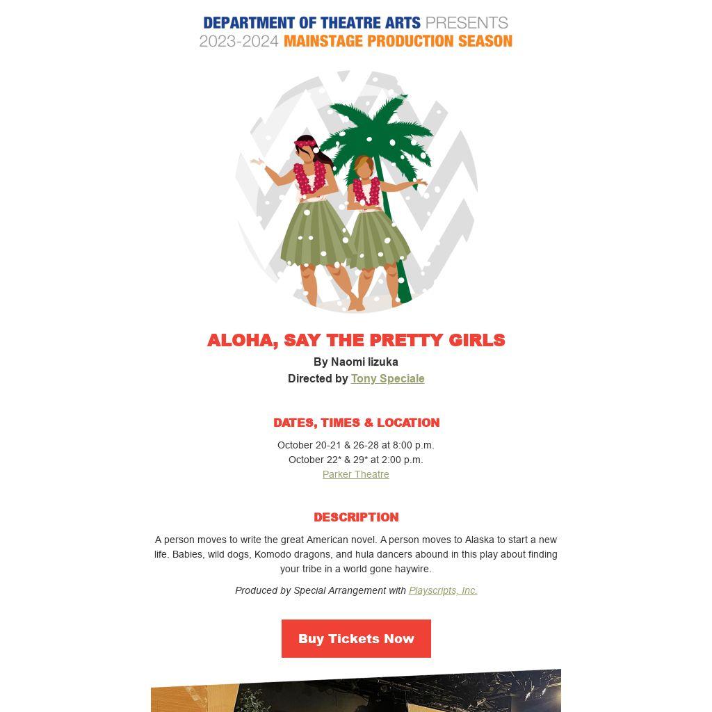 Aloha, Say the Pretty Girls is an absurdist coming-of-age-story about a group of young people who are interconnected through a serious of complicated relationships and chance events. It’s a play about losing and finding oneself, the bonds we create with friends and family, and the moments of synchronicity that can transform and shape our lives.