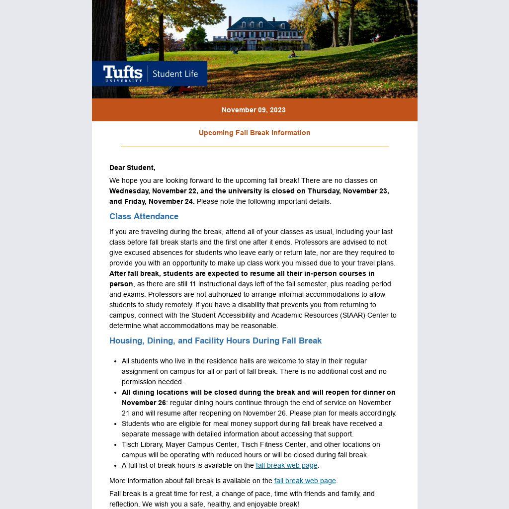 - Tisch Library, Mayer Campus Center, Tisch Fitness Center, and other locations on campus will be operating with reduced hours or will be closed during fall break.