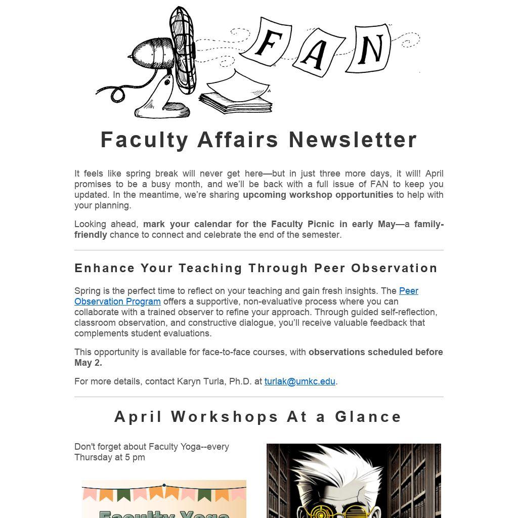 Looking ahead, mark your calendar for the Faculty Picnic in early May—a family-friendly chance to connect and celebrate the end of the semester.