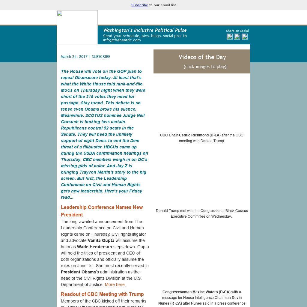 The House will vote on the GOP plan to repeal Obamacare today. At least that’s what the White House told rank-and-file MoCs on Thursday night when they were short of the 215 votes they need for passage. Stay tuned. This debate is so tense even Obama broke his silence. Meanwhile, SCOTUS nominee Judge Neil Gorsuch is looking less certain. Republicans control 52 seats in the Senate. They will need the unlikely support of eight Dems to end the Dem threat of a filibuster. HBCUs came up during the USDA confirmation hearings on Thursday. CBC members weigh in on DC’s missing girls of color. And Jay Z is bringing Trayvon Martin's story to the big screen. But first, the Leadership Conference on Civil and Human Rights gets new leadership. Here’s your Friday read...