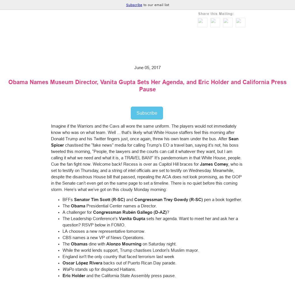 Imagine if the Warriors and the Cavs all wore the same uniform. The players would not immediately know who was on what team. Well ... that’s likely what White House staffers feel this morning after Donald Trump and his Twitter fingers just, once again, threw his own team under the bus. After Sean Spicer chastised the “fake news” media for calling Trump’s EO a travel ban, saying it’s not, his boss tweeted this morning, “People, the lawyers and the courts can call it whatever they want, but I am calling it what we need and what it is, a TRAVEL BAN!” It’s pandemonium in that White House, people. Cue the fan fight now. Welcome back! Recess is over as Capitol Hill braces for James Comey, who is set to testify on Thursday, and a string of intel officials are set to testify on Wednesday. Meanwhile, despite the disastrous House bill that passed, repealing the ACA does not look promising, as the GOP in the Senate can’t even get on the same page to set a timeline. There is no quiet before this coming storm. Here’s what we’ve got on this cloudy Monday morning:- BFFs Senator Tim Scott (R-SC) and Congressman Trey Gowdy (R-SC) pen a book together.