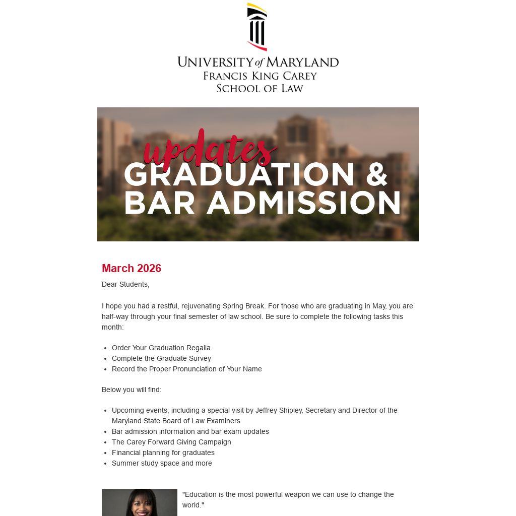 Jeffrey Shipley, Secretary and Director of the MD State Board of Law Examiners, will be on campus to discuss the NextGen bar exam and MD’s first administration this July 2026. This is a rare opportunity to hear directly from the Board and a national voice on the administration of the NextGen across the country. Even if you plan to sit elsewhere, you can benefit from the discussion.
