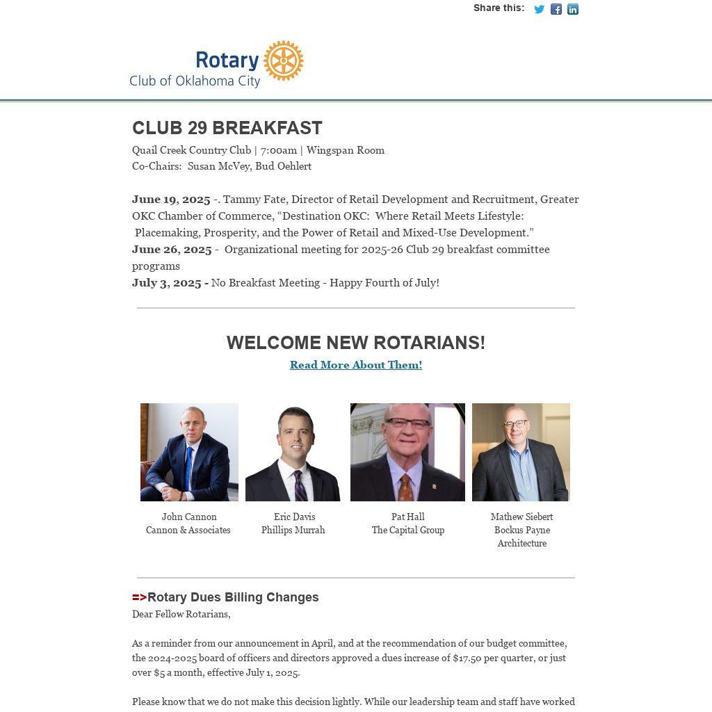 Rotary Club 29 has an online membership directory which contains current content information for all club members. The link to access the Club 29 directory can be found at the top of  the home page of  okcrotary.club or by clicking here.