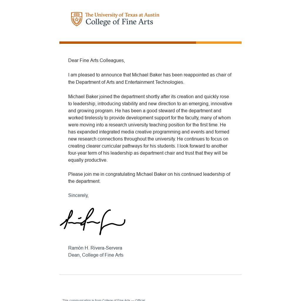 I am pleased to announce that Michael Baker has been reappointed as chair of the Department of Arts and Entertainment Technologies.