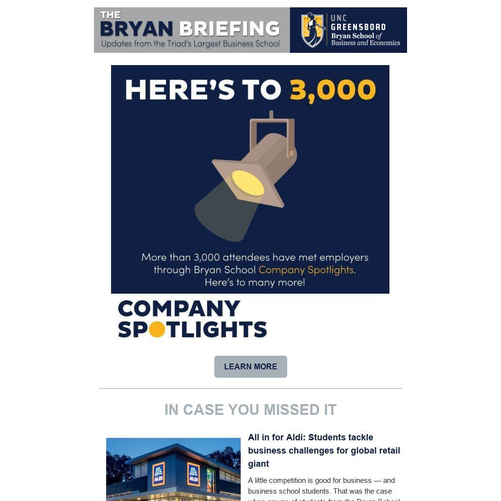 “I knew, you know, this is it this time. I’m going to be serious. I was going to get involved,” said Perrien. “I think it was during my Bryan School orientation I heard about the Company Spotlights. I’m pretty sure it was something simple, like one of the things UNCG does is bring companies in to make a presentation about what they do, and I thought that sounded interesting. They mentioned that sometimes people get internships and get hired and that it was a good way to network.”