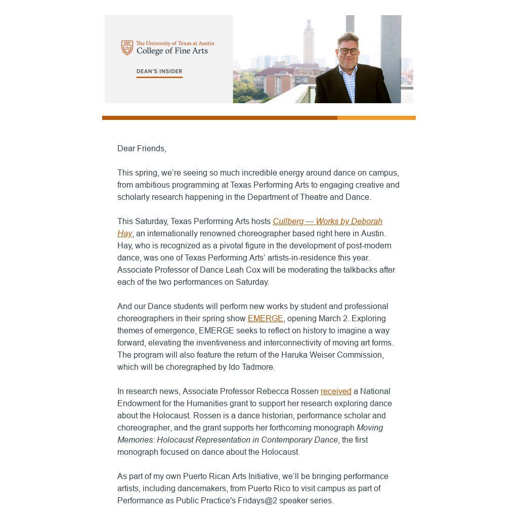 This spring, we’re seeing so much incredible energy around dance on campus, from ambitious programming at Texas Performing Arts to engaging creative and scholarly research happening in the Department of Theatre and Dance.