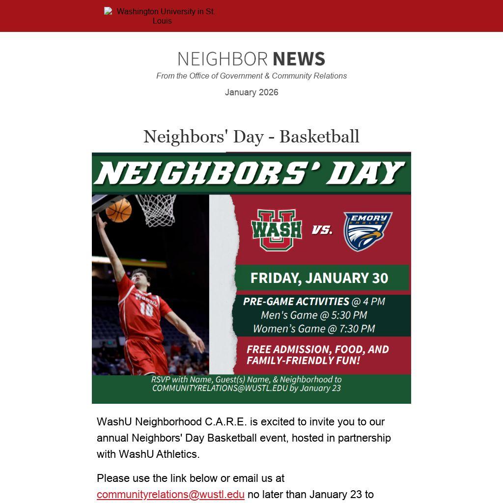 WashU Neighborhood C.A.R.E. is excited to invite you to our annual Neighbors' Day Basketball event, hosted in partnership with WashU Athletics.