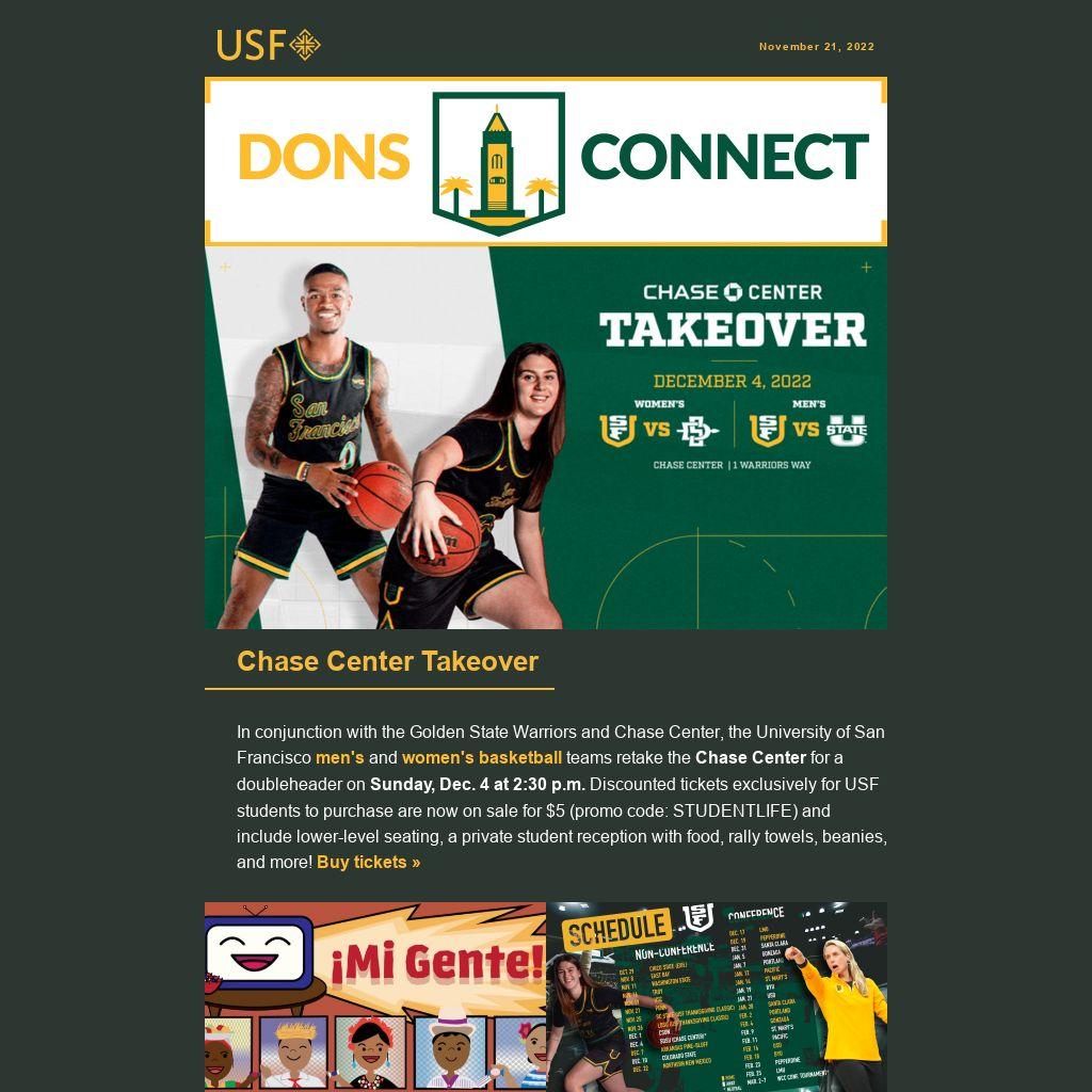 In conjunction with the Golden State Warriors and Chase Center, the University of San Francisco men's and women's basketballteams retake the Chase Center for a doubleheader on Sunday, Dec. 4at 2:30 p.m. Discounted tickets exclusively for USF students to purchase are now on sale for $5 (promo code: STUDENTLIFE) and include lower-level seating, a private student reception with food, rally towels, beanies, and more! Buy tickets »