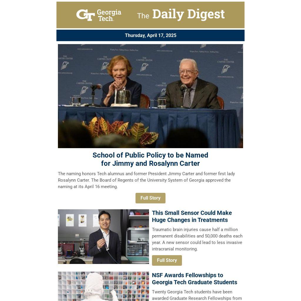 The naming honors Tech alumnus and former President Jimmy Carter and former first lady Rosalynn Carter. The Board of Regents of the University System of Georgia approved the naming at its April 16 meeting.