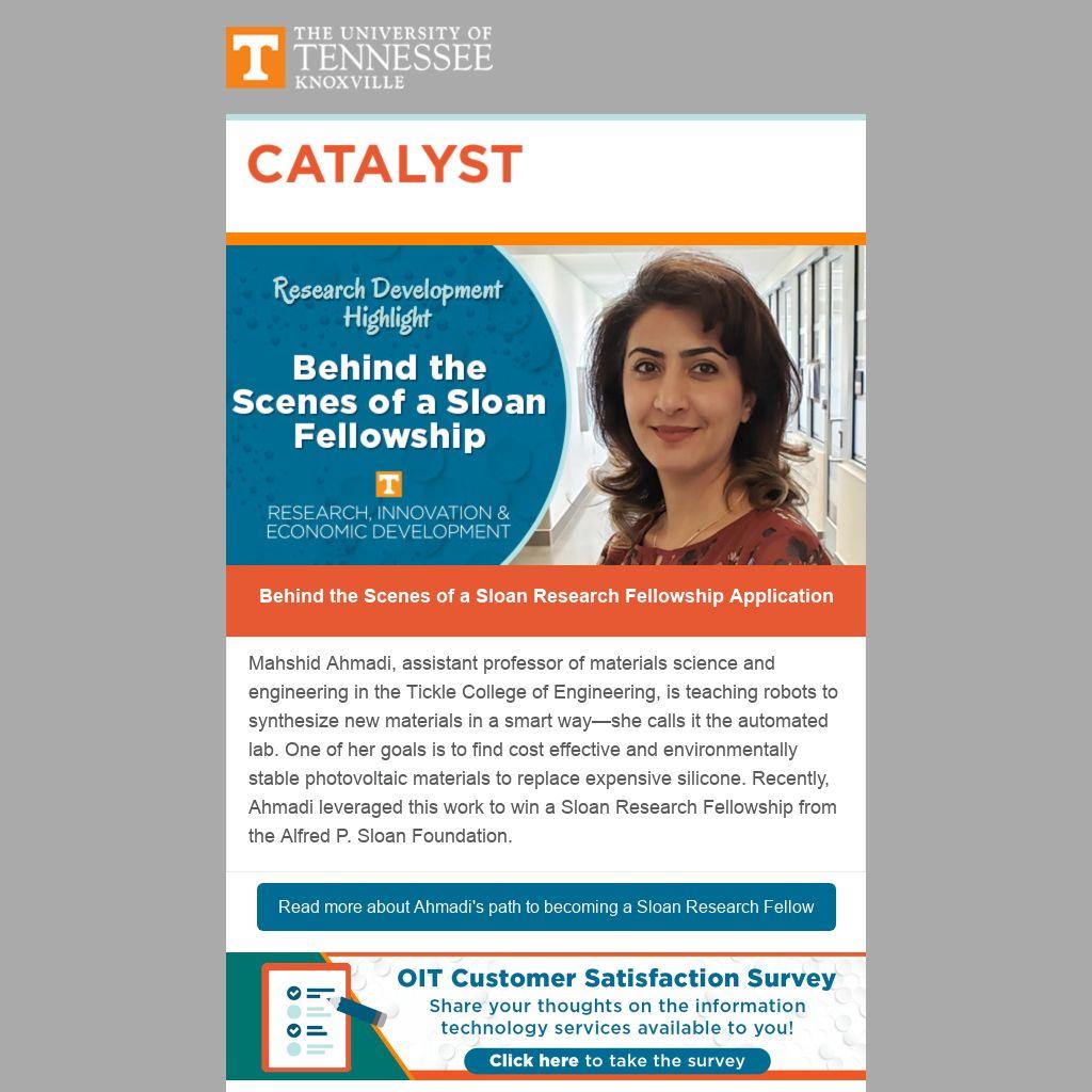 Mahshid Ahmadi, assistant professor of materials science and engineering in the Tickle College of Engineering, is teaching robots to synthesize new materials in a smart way—she calls it the automated lab. One of her goals is to find cost effective and environmentally stable photovoltaic materials to replace expensive silicone. Recently, Ahmadi leveraged this work to win a Sloan Research Fellowship from the Alfred P. Sloan Foundation.