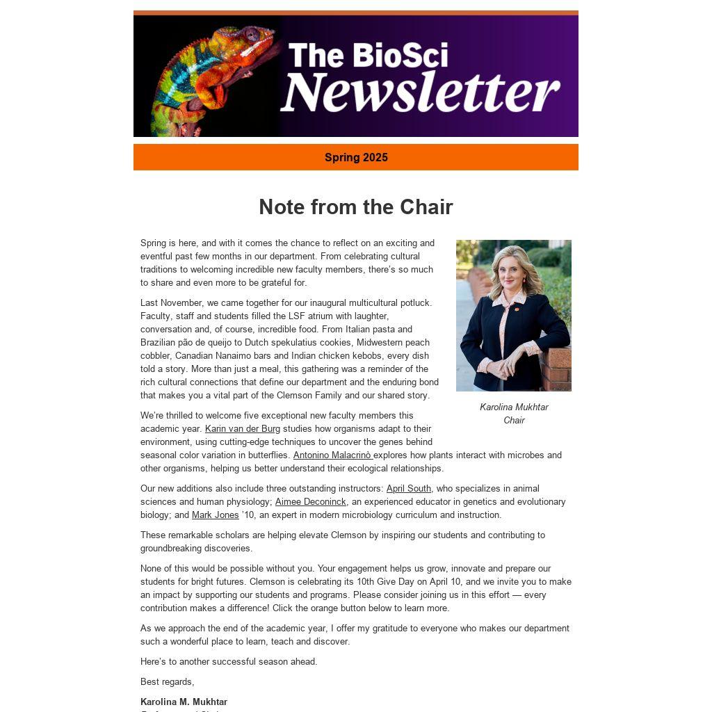 Last November, we came together for our inaugural multicultural potluck. Faculty, staff and students filled the LSF atrium with laughter, conversation and, of course, incredible food. From Italian pasta and Brazilian pão de queijo to Dutch spekulatius cookies, Midwestern peach cobbler, Canadian Nanaimo bars and Indian chicken kebobs, every dish told a story. More than just a meal, this gathering was a reminder of the rich cultural connections that define our department and the enduring bond that makes you a vital part of the Clemson Family and our shared story.